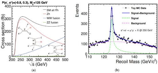 At the ILC Higgs factory, the main channel to produce Higgs particles is the so-called Higgstrahlung process as shown in Figure 7a. The cross sections of this process as well as other processes to produce Higgs particles—the vector-fusion processes —are shown in Figure 7a. The cross section of the Higgsstrahlung process peaks around collision energy of 250 GeV.