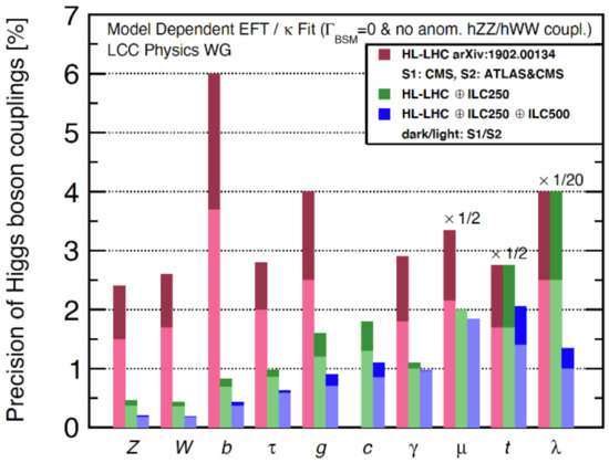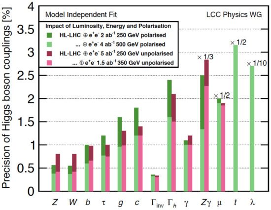In Figure 9, relative precisions obtainable by the data with and without polarizations are shown for Higgs couplings to various particles as well as for the partial decay rate to invisible final state and the total Higgs decay rate. They all correspond to the cases where the results of the ILC are combined with those of upgraded LHC (HL-LHC). The dark green shows the precisions obtainable by 2 ab−1 of data at the ILC250 (Higgs factory) with polarizations and the dark red by 5 ab−1 of ILC250 data without polarizations. Relative merits with polarizations depend on modes and simple conversion to a gain factor of effective luminosity is not possible. One can see, however, that 2 ab−1 of data with polarizations is roughly equivalent to 5 ab−1 of data without polarizations.