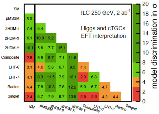 These precision measurements make it possible to distinguish different new physics scenarios through the pattern of deviation from the Standard Theory. Figure 10 shows the separation power of the ILC Higgs factory for 9 models that are unlikely to be rejected by the upgraded LHC. The number in each grid is the number of standard deviations between the two models represented by the grid. In most cases, the models can be distinguished with significance of several standard deviations. Thus, it can be said that the ILC Higgs factory can more or less pinpoint the correct theory or if the true theory is not in the list of proposed theories, it can tell what kind of theory is the true theory.