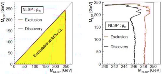 An example for pair creation of new particle that decays to the dark matter candidate and a muon: [9]. The regions for 5σ discovery and 95% exclusion are shown. The analysis corresponds to 500 fb−1 of data taken at collision energy of 500 GeV. The signature for 250 GeV collision energy is essentially the same.