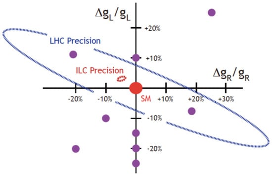 The right–handed and left–handed top coupling to the Z are shown for the Standard Theory and other new theories. The ILC precision is shown as the dotted red oval near the center [24].