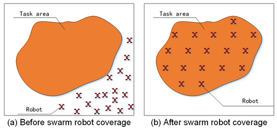 . When the coverage error is less than , the coverage rate of the swarm robotic system is large enough to meet the requirements of task completion. The completion time of coverage is defined as , i.e.: The swarm robots cover the unknown area, and the coverage of the individual robot is a circle with a center of the robot and a radius of . The adjacent robots can form a network through local communication. The shape of the covered area is usually irregular and unknown, which requires the swarm robots to cover the area as much as possible. At the same time, the urgency of each task point in the area requires the swarm robot to have a smaller coverage time.