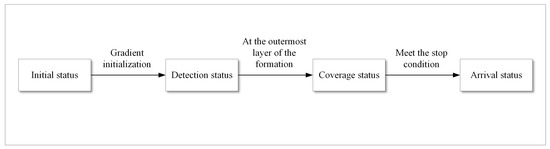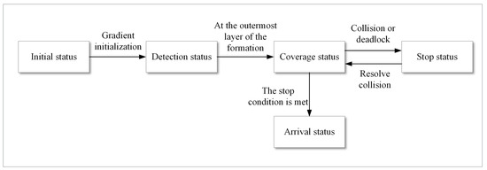Input: the robot without gradient Output: the robot covered the target area 1. Initialization: all robots are in Initial status, and gradient is initialized to infinity 2. while ( != Arrive) do 3. if == Initial then 4. Algorithm I: Gradient generation algorithm; 5. end if 6. if == Detection then 7. = ture; 8. if then 9. if then 10. = false; 11. end if 12. end if 13. if == ture then 14. if = Deploy; 15. end if 16. end if 17. if == Deploy then 18. Algorithm IV: Self-organizing grouping algorithm; 19. Algorithm V: Deadlock detection algorithm; 20. end if 21. if == Stop then 22. Algorithm VI: Deadlock release algorithm; 23. end if 24. end while |