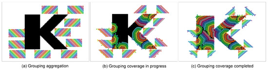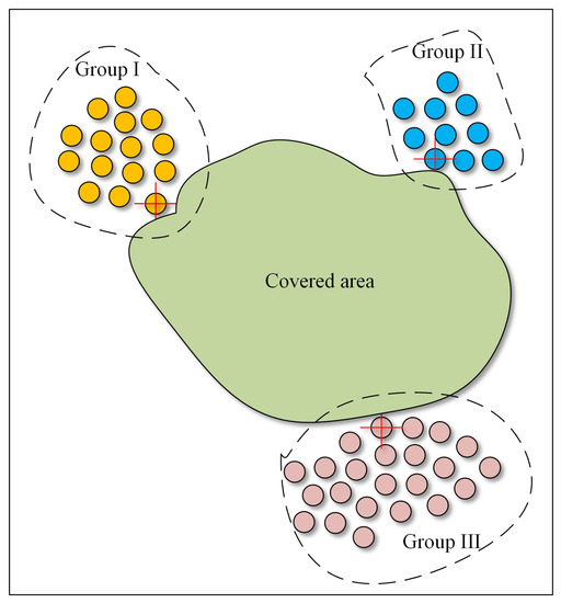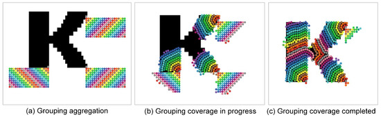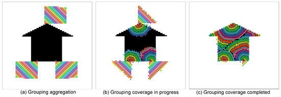 Figure 5 shows the area covered by multiple groups of robots. In the coverage process of multiple groups of robots, the self-organization behavior of coverage is consistent with that of a single group. Each group will execute the area coverage algorithm based on gradient independently.