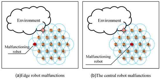 Figure 10b shows that the failure robot is in the closed-loop surrounded by the swarm robot group. At this time, the failure robot