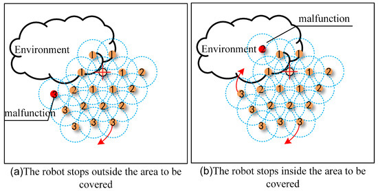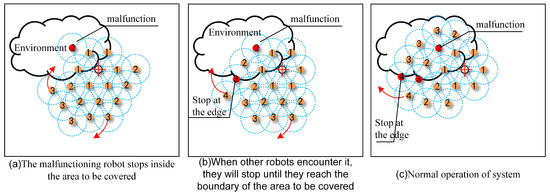 can move. In both cases, when there is a robot failure, the whole system cannot be brought to a state of paralysis, and the normal coverage task can be completed in the end.