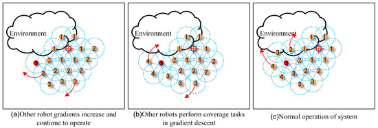 is infinite at this time, according to the region coverage algorithm in algorithm II, the failure robot is in the coverage state first, still moves around the nearest robot, updates the gradient at all times, and finally covers normally.