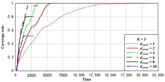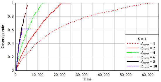 If the coverage radius of the individual robot remains unchanged, the factors affecting the coverage rate mainly include the coverage distance of the robot and the number of robots entering the coverage area. When the coverage distance of the robot increases to greater than its coverage radius (), it will lead to the coverage rate less than 100%. The larger the coverage distance is, the smaller the coverage rate will be.
