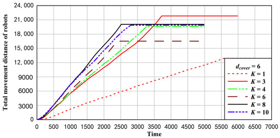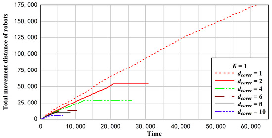 The total moving distance of the robot reflects the total moving energy consumption of the whole robot system. The smaller the moving distance, the smaller the energy consumption of the robot. It is one of the conditions to judge whether the coverage distance is suitable to discuss the influence of the coverage distance on the total moving distance of the robot. Similarly, keeping other parameters unchanged, we explored the changes of the total moving distance of the robot with time when the covering distance