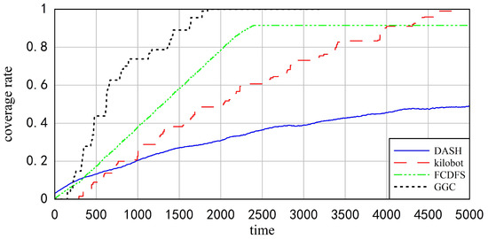Figure 24. We intuitively found that the GGC algorithm was optimal in both coverage completion time and coverage. Because the DASH algorithm dynamically adjusts the distance between the robots in real time, the speed of covering completion is relatively slow. In the angle-first (FCDFS) algorithm, the swarm robots continuously enter the area to be covered according to the line state, which makes the curve of the experimental results relatively smooth, at the same time, in the coverage process of the FCDFS algorithm, the arrangement of swarm robots is relatively standard, and there is an interval between adjacent robots, resulting in the coverage rate cannot reach 1. We can also see that the GGC and Kilobot algorithms start to enter the area to be covered after a certain period of time. This is because robots with a higher gradient are the farthest from the area to be covered and need to move around robots with a lower gradient first before they can enter the area to be covered and perform the covering task.