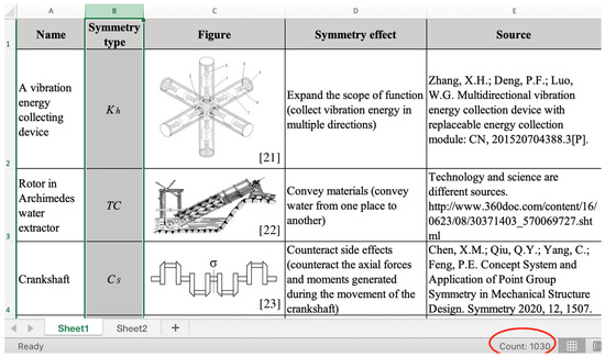 The examples analyzed in this work come from patents, papers and common mechanical structures. The specific analysis process of each example is similar to that of the examples given in this paper, that is, analyzing the symmetry types and symmetry effects of the structures. The analysis results of 1030 examples are organized in an Excel sheet, which is the basis for summarizing symmetry types, symmetry effects and symmetry rules later. Figure 2 is a fragment of the sheet, showing the total number of the analyzed examples and the main analysis contents [21,22,23].