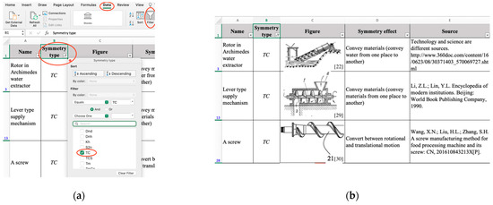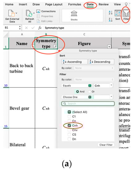 Clicking “Data” and “Filter” in turn further summarizes the contents in the Excel sheet. By filtering symmetry types, the effects of each symmetry type can be obtained. Take as an example: Figure 4a shows the process of filtering , and Figure 4b shows the filtered results [25,26,27]. It can be found that the elements of most symmetry types realize functions or improve performances independently.