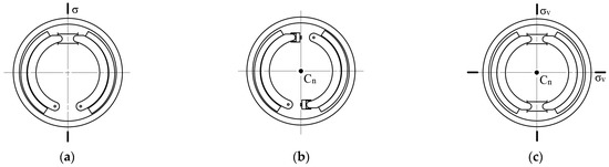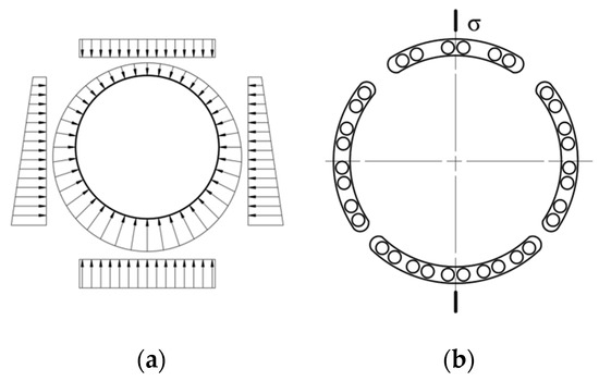 Reducing symmetry elements generally includes the reduction of their types and quantities, which is complementary to increasing symmetry elements. In the absence of special asymmetry factors, it is usually adopted to increase the type and quantity of symmetry elements to improve the structure performance, but in practical applications, such as error-proofing design and environment asymmetry, the symmetry elements need to be reduced. Figure 12a shows the distribution of water and soil pressure when the shield machine is working. It can be seen that the resistance on the upper side of the shield is smaller than that on the lower side. In order to match the thrust force obtained by the cutter head of the shield machine with the working environment, the uneven pressure distribution should be considered in the layout of the hydraulic cylinder. As shown in Figure 12b, the layout of the hydraulic cylinder only retains the left and right mirror symmetry, breaking the upper and lower mirror symmetry. This design of breaking the symmetry makes the shield adapt to the impact of the asymmetry of the external environment, avoids system failure caused by the greater force on the lower part, and improves the working reliability of the shield machine [41].