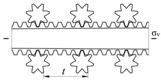 , , , , , and are all composed of the symmetry elements , , and , and their effects are also composed of the effects of symmetry elements. is mainly used to expand the scope of function, increase the intensity of function, support or transfer materials. The effects of , and are shown in Table 4. As shown in Figure 7, the symmetry type of the rack and pinion lifting mechanism is . The symmetry elements are and . improves the bearing capacity of the lifting mechanism, that is, expands the scope of function. counteracts the unbalanced force and increases the stability in the working process [31].