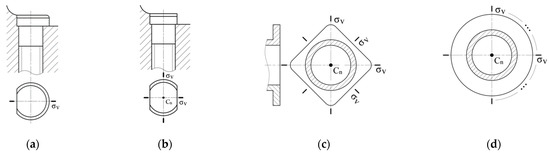 As shown in Figure 9a, in order to adapt to the shape of the connecting piece, the bolt head is cut on one side, and its symmetry type is . However, one-side cutting can easily cause side force, leading to bending. This situation can be avoided by double-side cutting, that is, adding a mirror plane and a rotational axis so that the symmetry type of the bolt head becomes , as shown in Figure 9b. The symmetry type of the square flange shown in Figure 9c and the circular flange shown in Figure 9d are , but the number of symmetry elements is different. The square flange with four mirror planes needs to be machined on other machine tools, such as a milling machine, after turning, while the circular flange with infinite mirror planes can be machined directly on the lathe, which reduces the difficulty of machining [37].