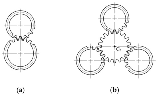 A gear pair can be regarded as the superstructure of a gear, which is usually used to transmit rotation and power. The single gear pair shown in Figure 11a is the substructure of the three gear pairs shown in Figure 11b. The superstructure can not only realize the transmission function, but also counteract side effects and an equal load to expand the scope of function, such as planetary gears and new gear pumps [40].