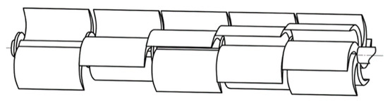 Figure 14 shows an example of symmetry hierarchy breaking caused by increasing the function intensity and preventing resonance; a vertical wind turbine, which divides the impeller into several parts. The symmetry type of each part is , and the number of blades in each part is different, so the of the superstructure is broken. Therefore, the harmonic components generated by the rotation of each part interfere with each other, which changes the natural frequency of the impeller, preventing the occurrence of resonance [43]. The impeller of the wind turbine with breaking also makes the wind energy in the different height space be effectively utilized, which increases the function intensity.