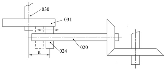 In the solving process, symmetry classifications and symmetry effects are flexibly used; finally, the structure for meeting the requirements of speed change is obtained, as shown in Figure 21. Compared with the existing shaft transmission device shown in Figure 16, this structure mainly adds a section of reciprocating thread on the shaft (020) and a pair of gears, (012) and (022), to realize the conversion between rotation and translation. A group of rods (023) are added to realize the transmission of rotation and torque. A pair of ratchets, (013) and (014), are added to avoid mutual interference between the two transmission routes.