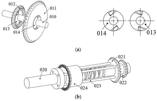 The above two transmission processes must not interfere with each other, so a pair of one-way ratchets should be used to control the transmission route of motion and power. As the intermediate link of transmission, the layout of rotors on the intermediate shaft (020) is constrained by input and output. Combined with the previous analysis, structures of the input shaft and intermediate shaft and the rotors on them are shown in Figure 20. Considering the simplicity of manufacturing, ratchet (013) and ratchet (014) have the same size and opposite direction, forming .