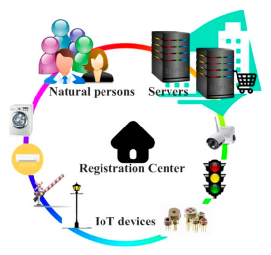 RC is a trusted third party, which is responsible for the system setup and performing the registration, revocation, and key updating for members. Servers can have a variety of functions, such as providing services for NPs, monitoring and controlling IoT devices, and gathering and analyzing data from IoT devices. A server may be a cashier, an automated teller machine (ATM), a housekeeper, a web service provider, a cloud service provider, a medical service provider, a library, a school, a company, a bank, a city control center, a government department, etc. An IoT device is assumed to have embedded physical unclonable functions (PUFs) and low computational capability; it may be a sensor, electrical appliance, traffic signal, streetlight, surveillance camera, vehicle, etc. In addition, we summarize the notations in Table 1.