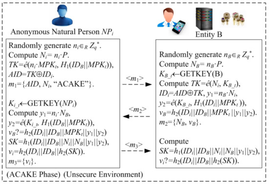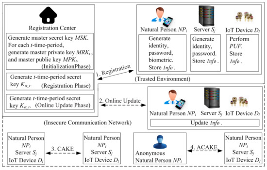 A fuzzy extractor [29] or helper data algorithm can generate stable cryptographic keys with appropriate entropy from noisy and non-uniformly distributed random PUF responses [30,31,32]. Here, we present the framework of the proposed CAKE and ACAKE protocols. The ACAKE protocol is an extended CAKE protocol, which additionally provides an anonymity option for natural persons to protect their privacy. The framework of the proposed CAKE and ACAKE protocols consists of four phases, namely, initialization phase, registration phase, online update phase, and CAKE/ACAKE phase. Figure 2 presents the framework of the proposed CAKE and ACAKE protocols.