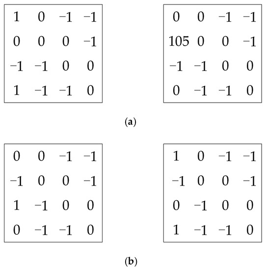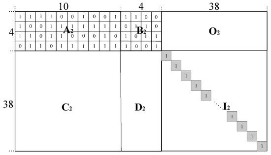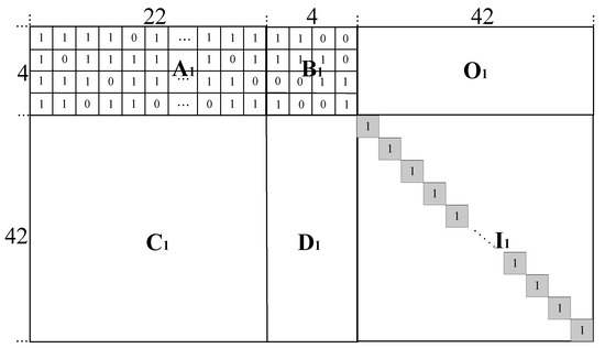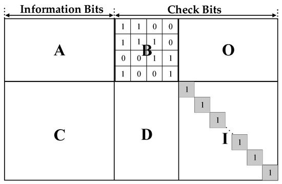 In the matrix above, each 1 in HBG represents a 4 × 4 binary circulant permutation matrix (CPM), and each 0 represents a 4 × 4 zero matrix; that is, the size Z of the matrix in Equation (1) is 4. The HBG of each QC-LDPC code intuitively indicates the position of the CPM in the check matrix by the distributions of elements ‘1’, providing an important reference in the encoder design of corresponding codes.