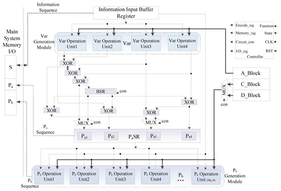 - The second step is used to execute the D·PaT operation and complete the computation of PbT = C·ST + D·PaT. The Pb operation units from 1 to (Mb − 4) receive the check bits Pa(j) generated by the Pa generation module in parallel. At the same time, the cyclic shift coefficients at the corresponding positions of the D_ROM are sent to the Pb operation units. The cyclic shift coefficients of one column in the D_ROM are read each time (the coefficients’ number of one column corresponds to the number of Pb operation units). The coefficients of the column are then sent to each Pb operation unit synchronously. The operation units will accurately execute cyclic-shift operations to the Pa check bits (Z-bit) immediately. Such operations are used to replace the multiplication of D·PaT to obtain the D1j·Pa(j), D2j·Pa(j), ···, D(R-4)j·Pa(j). Then, the (Mb − 4) sequence values will be performed XOR operations in parallel with the current values of the state register in each Pb operation unit. The completion of PbT = C·ST + D·PaT only requires 4 clock cycles after the operations in the first step are finished.