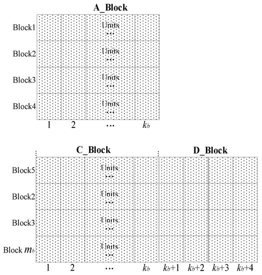 The computation process of Equation (24) is executed in parallel. Taking BG1 as an example, the size of the submatrix C is 42 × 22: