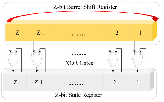As the core operation unit of the encoder, the encoding operation unit is mainly used to realize operations in the α·βT form. The Var operation module containing α·βT encoding units is mainly used to execute the A·ST operation, while the Pb generation module containing α·βT units is mainly used to execute the operation process of [C D]·[S Pa]T. The circuit structure of the encoding operation unit is shown in Figure 7. The operation unit consists of a Z-bit barrel shift register, a row of XOR gates and a Z-bit state register.