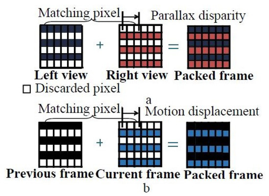 Recently, with the increasing popularity of 3D contents, 3DTV broadcasting services becomes a reality. However, compared with convention digital TV (DTV) broadcasting services, 3DTV needs double the transmission bandwidth for the same video resolution since the left and right frame of 3D video are required to perceive 3D contents [1,2]. To utilize existing transmission infrastructure including teh H.264/AVC compression scheme, the compatibility of 3D video with conventional digital television (DTV) transformation format is strongly required [3,4]. The existing broadcasting network can be used by converting the 3D video format into a single DTV frame. For example, a top–bottom packing after the horizontal line sub-sampling can be treated as a single frame of the existing DTV. Other packing methods include side by side, interleaved formats [5]. The existing 3D compatible frame packing formats are shown in Figure 1.
