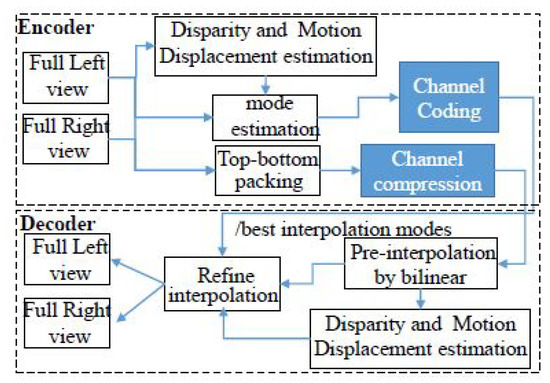 In this paper, the idea of exploiting the correlations of inter-frames optimally at the encoder to leverage interpolating the top–bottom packed stereoviews at the decoder is implemented. The first motivation is that the need-to-be-interpolated pixels on the discarded horizontal line of one frame of the current view can be recovered by the corresponding pixels that are not discarded on the other view frame. This is the characteristic of the well-rectified stereo image as the result of epipolar constraint. To obtain the best perception of 3D effects, epipolar constraint states that the corresponding pixel in the right image to the considered pixel in the left image stay on the same row. The second motivation is that the inter-frame correlation is significantly high for frames of a single view. As a result, the current frame’s information can exist in the adjacent frames, such as previous or subsequent frames. As a result, the current frame’s information can exist in the adjacent frames, such as previous or subsequent frames. Figure 2 is an overview of the transmission system.