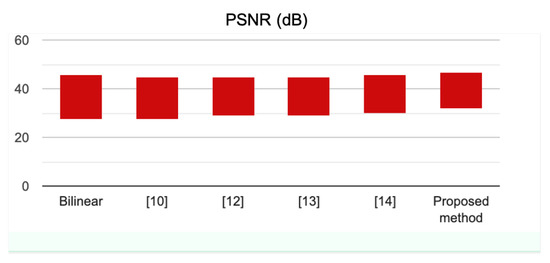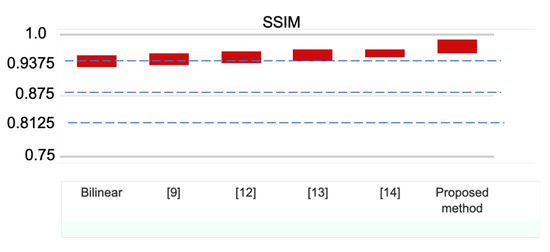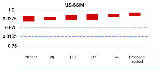We calculated the ANOVA Fisher’s least significant difference (LSD) procedure the multicomparison post hoc statistical test to check which pairs of means have a significantly different variation from the mean PSNR, SSIM, and MS-SSIM of different interpolation methods. The numerical data are shown in Figure 4 for PSNR, Figure 5 for SSIM, and Figure 6 for MS-SSIM, respectively. As one can observe, the performance of the method [14], which is the second-best method, is considerably lower than proposed optimal mode based interpolation technique. Even though the proposed method’s execution time is slightly higher than the Bilinear and [14], the proposed method outperformed all validated methods in PSNR, SSIM, and MS-SSIM with significant margins and comparable standard deviations.