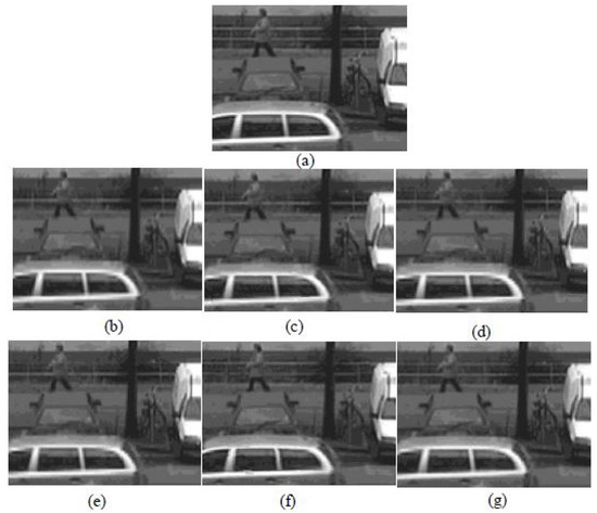 Figure 7. Visualized comparison after the interpolations for the Moabit sequence: (a) original image; (b) cropped original; (c) NEDI6 [9]; (d) pixel-based matching [12]; (e) patent [13]; (f) paper [14]; and (g) proposed method.