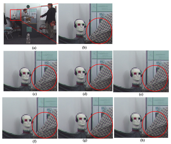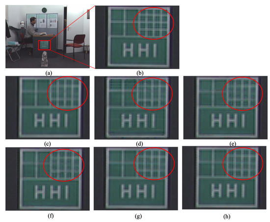 Figure 8. Zooming in for a visualized comparison between the interpolation methods for the Door sequence: (a) original image; (b) Bilinear; (c) cropped original; (d) NEDI6 [9]; (e) pixel-base matching [12]; (f) patent [13]; (g) paper [14]; and (h) proposed method.