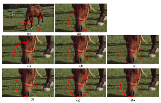 Figure 9. Zooming in for a visualized comparison between the interpolation methods for the Horse sequence (a) original image; (b) Bilinear; (c) cropped original; (d) NEDI6 [9]; (e) pixel-base matching [12]; (f) patent [13]; (g) paper [14]; and (h) proposed method.
