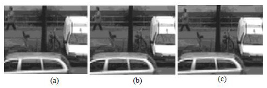 Figure 12. Depth images from the left and right interpolated frame: (a) ground true; (b) method [14] with PSNR 21.124 dB; and (c) the proposed method with PSNR 22.246.