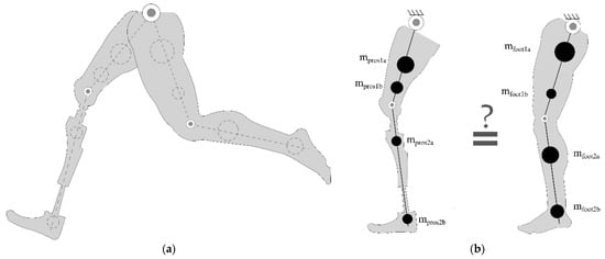 Dynamic model of an asymmetric human gait with double pendulums: (a) Modeling of an impaired gait with two different double pendulum systems; (b) different mass distributions on each leg represented by for the prosthetic side and for the healthy side with . The hypothesis in this study evaluates whether the two different legs can be made to move symmetrically.