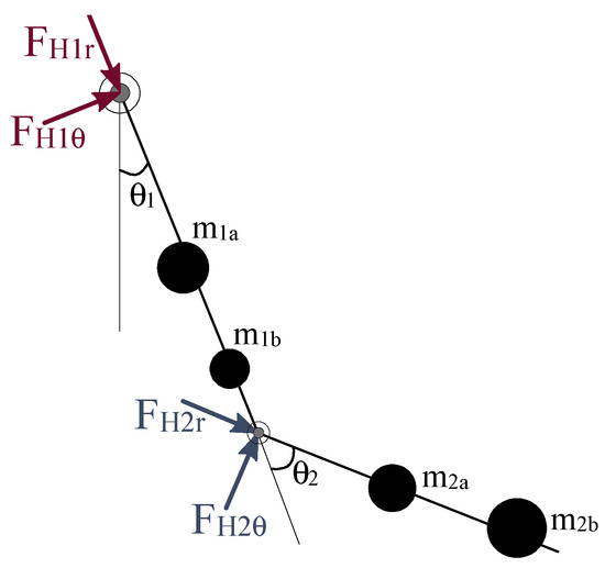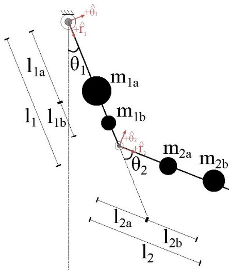 However, achieving a symmetric trajectory within an asymmetric dynamic model is not possible with every configuration. Handžić et al. [20] demonstrated that having only one mass on each link of a double pendulum system couples the moments of inertia. Therefore, any change in the system parameters would mean a change in the motion trajectory or force reactions since not enough parameters (masses, moments, or moments of inertia) exist to compensate for the change. However, adding a second point mass to each link creates an underdetermined system that would allow for a change in parameters without a change in kinematics. The authors derived kinematically matched coefficients (KMC) that determine for kinematically matching systems.