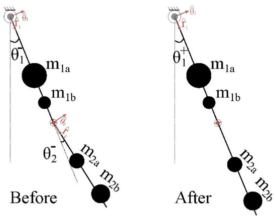 As a result of a knee-lock event, equations of motion for the system switches from Equations (8) and (9). However, angles and angular velocities change due to this collision. The new values can be calculated based on the before collision condition. In a leg with two links, is always bigger or equal to zero; meaning the knee cannot bend backward. Therefore, at , the middle hinge (knee) is locked, and the double pendulum is turned into a single pendulum. The dynamic model right before and after the knee collision is depicted in Figure 3.