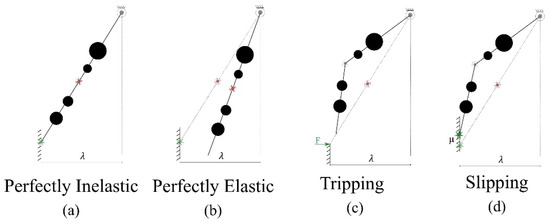 Modeling slipping (Figure 4d) on the surface introduces the stick-slip mechanism to the system. Calculating the velocity of the pendulum over the surface will depend on the static and kinetic friction coefficients between the wall and the pendulum at the contact point. This paper does not model this type of collision because this situation requires a lot of information and therefore assumptions about the material of the surface such as the shape of the second link foot, the static and kinetic friction coefficients between the two objects, and so on.