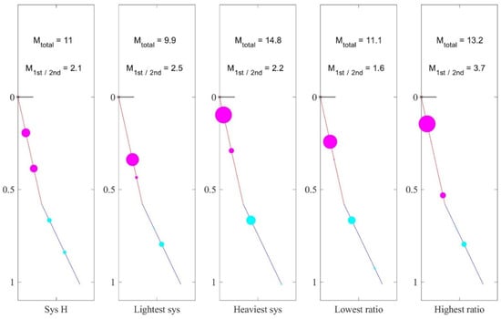Kinematically parallel system to Sys H with lightest total mass, heaviest total mass, lowest links’ mass ratios, and highest links’ mass ratios.