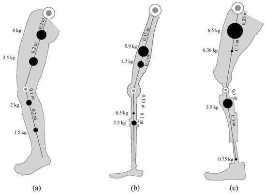 Prosthetic leg designs based on the anthropometric data of a healthy leg: (a) Anthropometric data for a healthy leg; (b) a dynamic model of a prosthetic design with symmetric kinematics and lightest weight; (c) a dynamic model of another prosthetic design with symmetric kinematics and the lowest ratio of mass between the links.