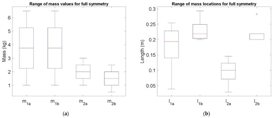 Variation in physical parameters between systems with full symmetry. Red lines indicate the median. The square specifies the lower and upper quartiles. Whiskers show the minimum and maximum values in each parameter. (a) Whisker plot of mass values, and in full symmetric pendulum systems; (b) Whisker plot of each mass locations, and in full symmetric pendulum systems.