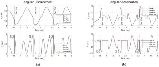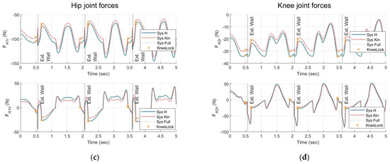 Kinematic and kinetic simulations of systems with different physical parameters but similar kinematic and kinetic coefficients. Sys H, Sys Kin, and Sys Full indicate the result for the anthropometric data, a sample of systems (365 solutions) with only kinematic symmetry, and a sample of systems (60 solutions) with full symmetry, respectively. (a) Angular displacement; (b) angular acceleration; (c) internal forces at hip joint; (d) internal forces at the knee joint.