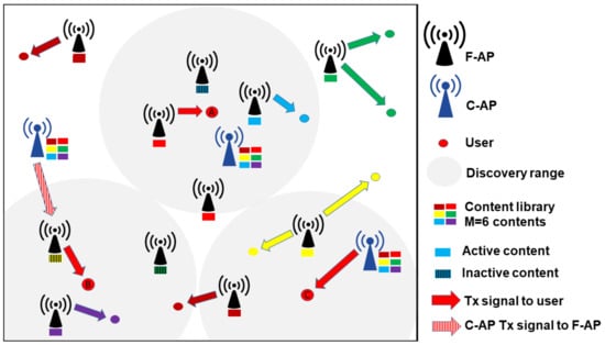 An available F-AP with respect to content m is defined as a F-AP that is not caching content m and caches an inactive content, where the probability of caching the inactive content is calculated as . Accordingly, the probability of the F-AP availability when content m is requested can be obtained by summing over the set of contents as follows