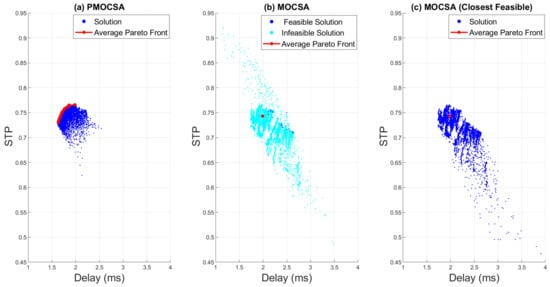 Moreover, the performance of the proposed caching scheme using PMOCSA was evaluated for different network parameters and compared with two well-known caching schemes, i.e., the Popular and Uniform schemes, where the proposed scheme could always achieve higher performance, i.e., higher STPs and lower delays, than the benchmark schemes for all the studied network parameters. The numerical results showed that in the considered F-RAN system, the STP and delay are not always inversely related. In other words, the increase in the STP does not always result in a decrease in the delay, which is mainly due to the gained STP improvement by fetching the requested contents from the C-APs is accompanied with a large average delays as a result of the C-APs’ poor content dissemination. The impacts of the network parameter on the performance of the proposed scheme were also analyzed. Specifically, the results demonstrated an increase in the STP and a decrease in the delay with the increase in the Zipf exponent, F-AP transmission bandwidth, C-AP transmission bandwidth, and C-AP density, and a decrease in the STP and an increase in the delay with the increase in the total number of contents, user density, and F-AP density. Whereas, the increase the discovery range led to an increase in the STP and delay, which is due to the higher probability of fetching the requested contents from the C-APs. Finally, bearing in mind that the Pareto front represents a set of solutions. Thus, a trade-off between the STP and delay is required to obtain the desired performance.