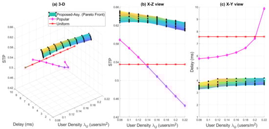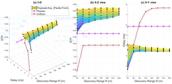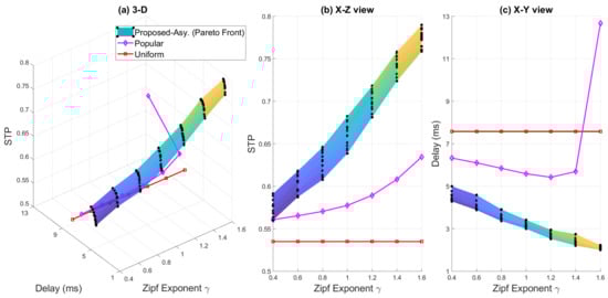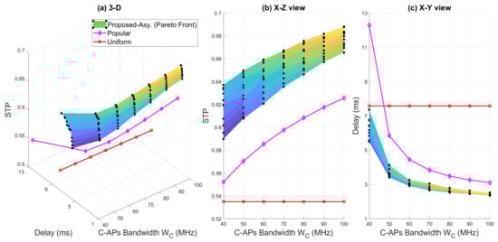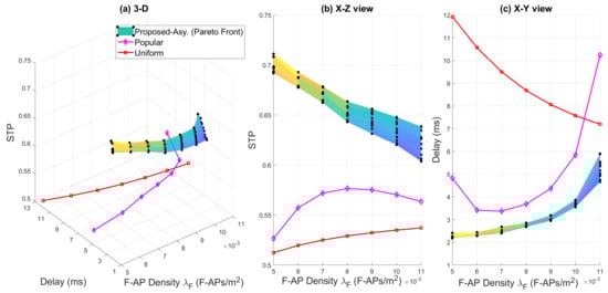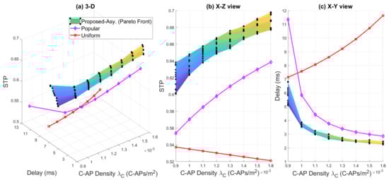 Figure 4 also shows that the average delay increases with discovery range for all schemes, which is due to the high delay of the contents dissemination by the C-APs since the contents have higher probabilities with the discovery range of being fetched from the C-APs directly or via transit F-APs. The poor performance of the contents dissemination by the C-APs is also the reason of the high delays of the Popular scheme at low discovery ranges (i.e., m), and the higher delays of Uniform scheme beyond this range due to the high probability of fetching the requested contents from the C-APs and the high separation distances between the and the transit F-APs. The Pareto fronts in Figure 4 indicates that the proposed multi-objective scheme can achieve higher STP, lower average delay, or both simultaneously than the benchmark schemes. We can observe that at high discovery ranges (i.e., m) the proposed scheme achieves 5–15% higher STPs and 30–40% lower average delays than the Popular scheme. It is also observed that the low average delays are obtained at the low STPs. Thus, a trade-off between the STP and delay is required to balance the performance.