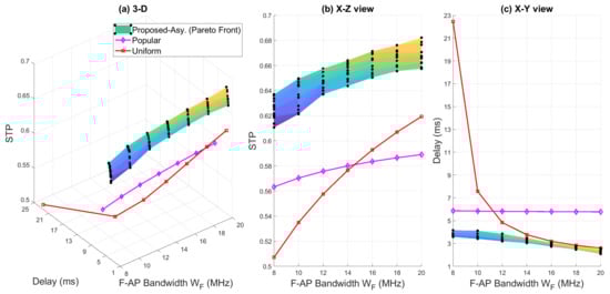 STP and delay versus F-APs’ bandwidth at , users/m, F-APs/m, C-APs/m, m, , , MHz, ms, and Mbps.