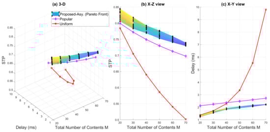 Figure 8 illustrates the relationship between the total number of contents M, STP and delay. Figure 8 shows that the performance degrades for all schemes as the total number of contents increases, which can be explained by the increase in the total number of contents, results in caching smaller percentage of them within the discovery range and in a lower popularity of the most popular content. It is observed that the total number of contents has higher influence on the Uniform scheme than the other schemes, which is due to the fact that the users are often served by direct F-APs. Figure 8 also shows that the Uniform scheme performs worse than the Popular scheme with the increase in the total number of contents. This due to the lower probabilities of the direct and transit F-APs with total number of contents. The obtained Pareto fronts shown in Figure 8 demonstrates that the proposed scheme outperforms the benchmark schemes.