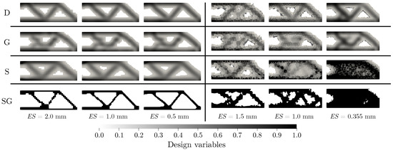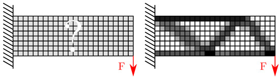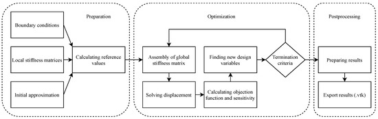 16] describes the preparation of local and global stiffness matrices. Still, some advanced recommendations are presented in this paper. At this stage, the global stiffness matrix is also assembled and the reference values of the objective function are calculated. Before optimization, it is also necessary to prepare an initial approximation of volume, i.e., the structural elements are assigned a new material model containing individual design variables for each element. Elements are assigned new values of elasticity modulus, which affect the global stiffness matrix and leads to a new value of the objective function with each iteration.